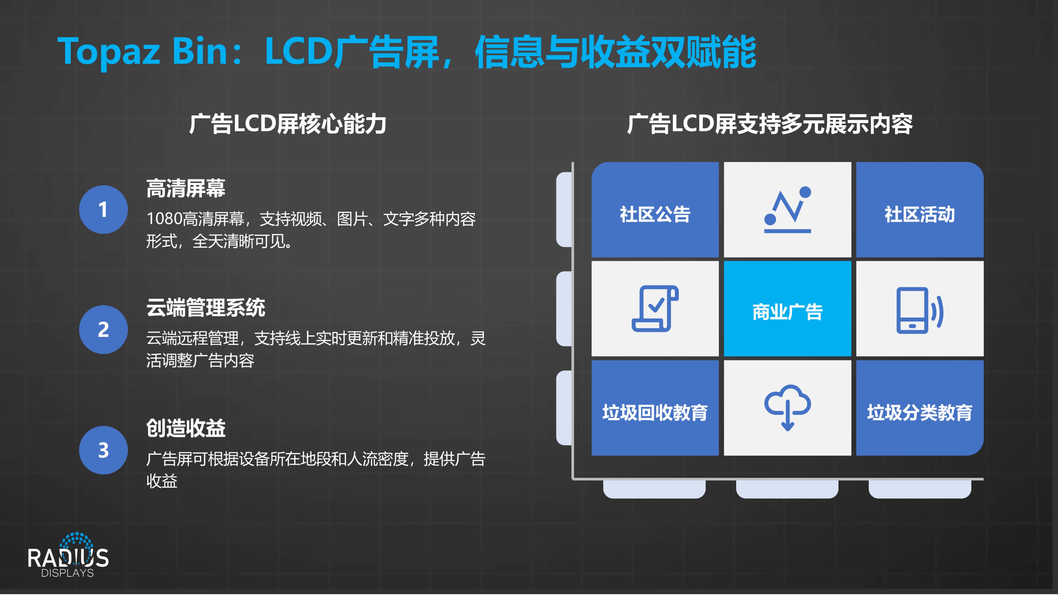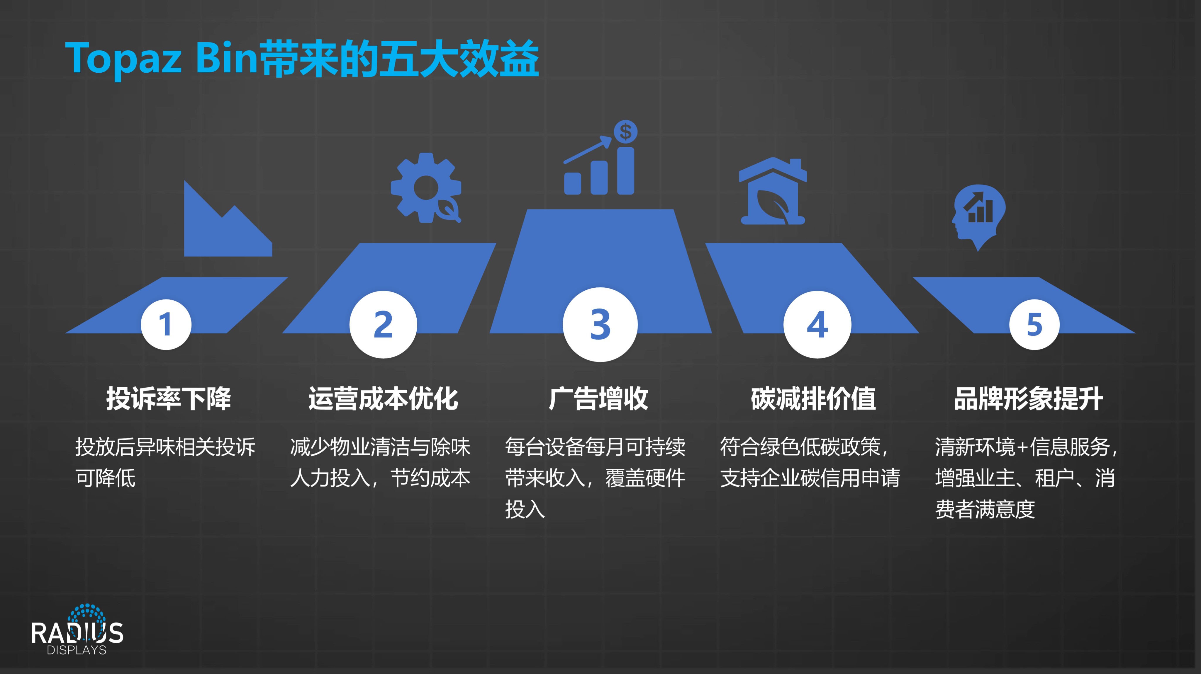 Topaz Bin 不只是环保回收箱,更是社区、商业和公共空间的物业及运营方的创新设施,兼具环保与广告收入功能,将传统的“成本中心”转化为全新的“价值节点”。